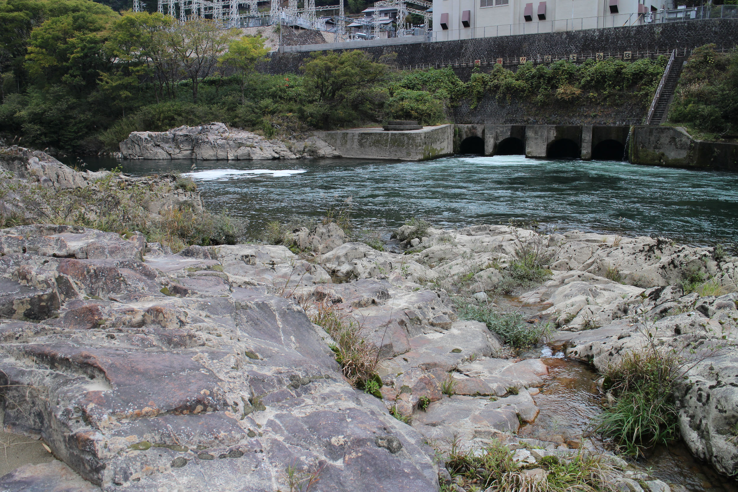 名倉発電所前の飛騨川河床に広がる河岐トーナル岩 (撮影:小井土由光) |