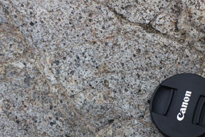 | 見学地点の解説 | 岩石全体が変質作用を受けて表面が暗褐色をなし、内部も褐色を帯びており、構成する鉱物の境界が不明瞭となっているが、等粒状の花崗岩組織を持つ岩石である。ただし、通常の花崗岩と異なり、カリ長石をほとんど含まず、無色鉱物のほとんどは斜長石で構成されている。それらの中でも石英をある程度含むものをトーナル岩、かなり少ないものを石英閃緑岩と呼び、場所により後者にあたる部分も見られる。有色鉱物としては板状の黒雲母が比較的多く含まれ、柱状の角閃石も含まれ、それらが花崗岩と比べて多く含まれる。 | |