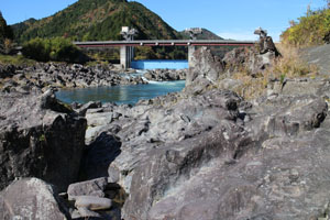 | 見学地点の位置・概要 | 飛騨川に沿って北上する国道41号は、飛騨金山へ至る直前で一時的に飛騨川沿いから離れる。その位置の飛騨川に七宗(しちそう)ダムがあり、その堤体から下流の飛騨川河床に多量の礫を含む田島火道角礫岩が露出している。堤体上の道路から左岸(北岸)を50mほど下流へ行くと河床へ下りる階段がある。 | |