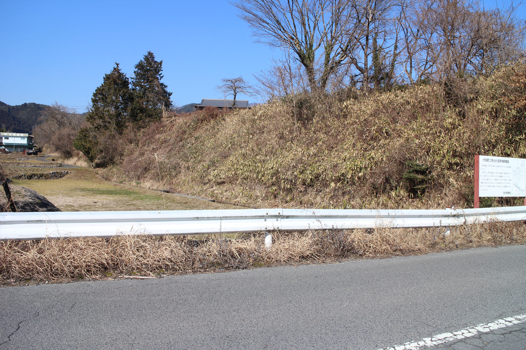 | 見学地点の解説 | 高さ7~10mの崖が阿寺断層により縦方向にずらされて形成された低断層崖であり、ほぼ直線的に北西へ向かって1kmほど続き、倉屋地区でそのまま山間部へ入り、そこに断層鞍部を形成している。この低断層崖は付知川の低位段丘面をずらしたものであるが、一見すると段丘崖のように見える。しかし、この場所の北東側を流れる付知川の流路とは反対側の南西側に崖を形成しており、付知川の流路とこの低断層崖が斜交することから段丘崖ではないことがわかる。 | |