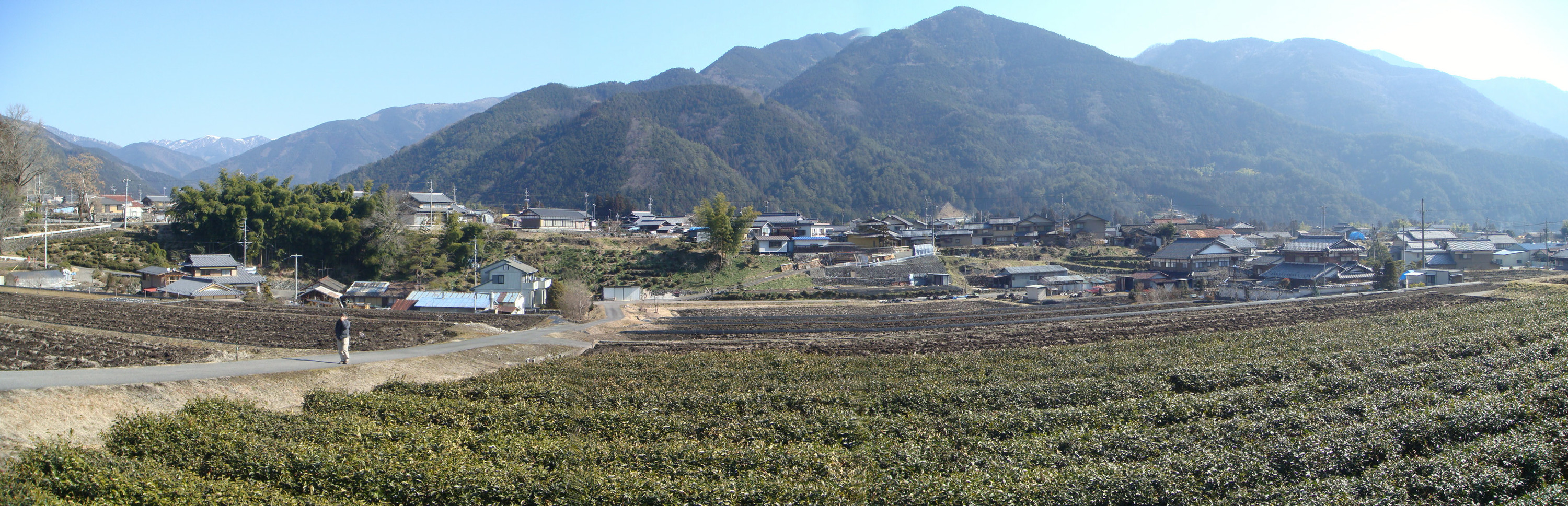 付知大門(右端)から北西へ倉屋(左端)まで延びる断層崖(写真中央に延びる段差)を南西側からみた景観 (撮影:小井土由光) |