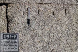 ピラミッドを作る石(苗木花崗岩)と解説 (撮影:小井土由光) |