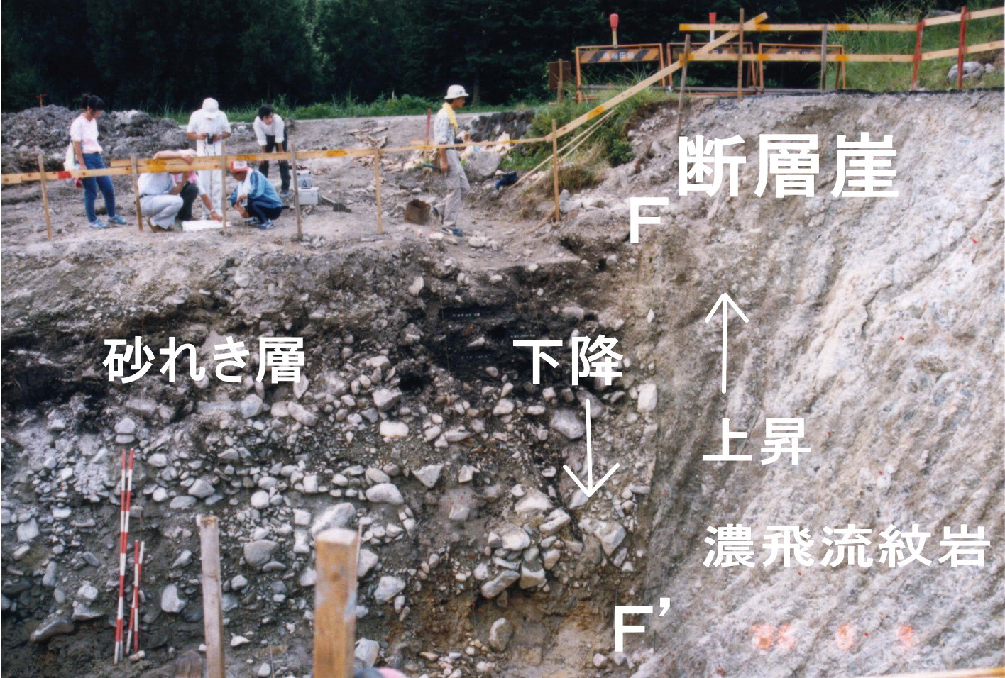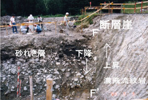 三ツ石における湯ヶ峰断層のトレンチ現場 (撮影:下畑五夫) |