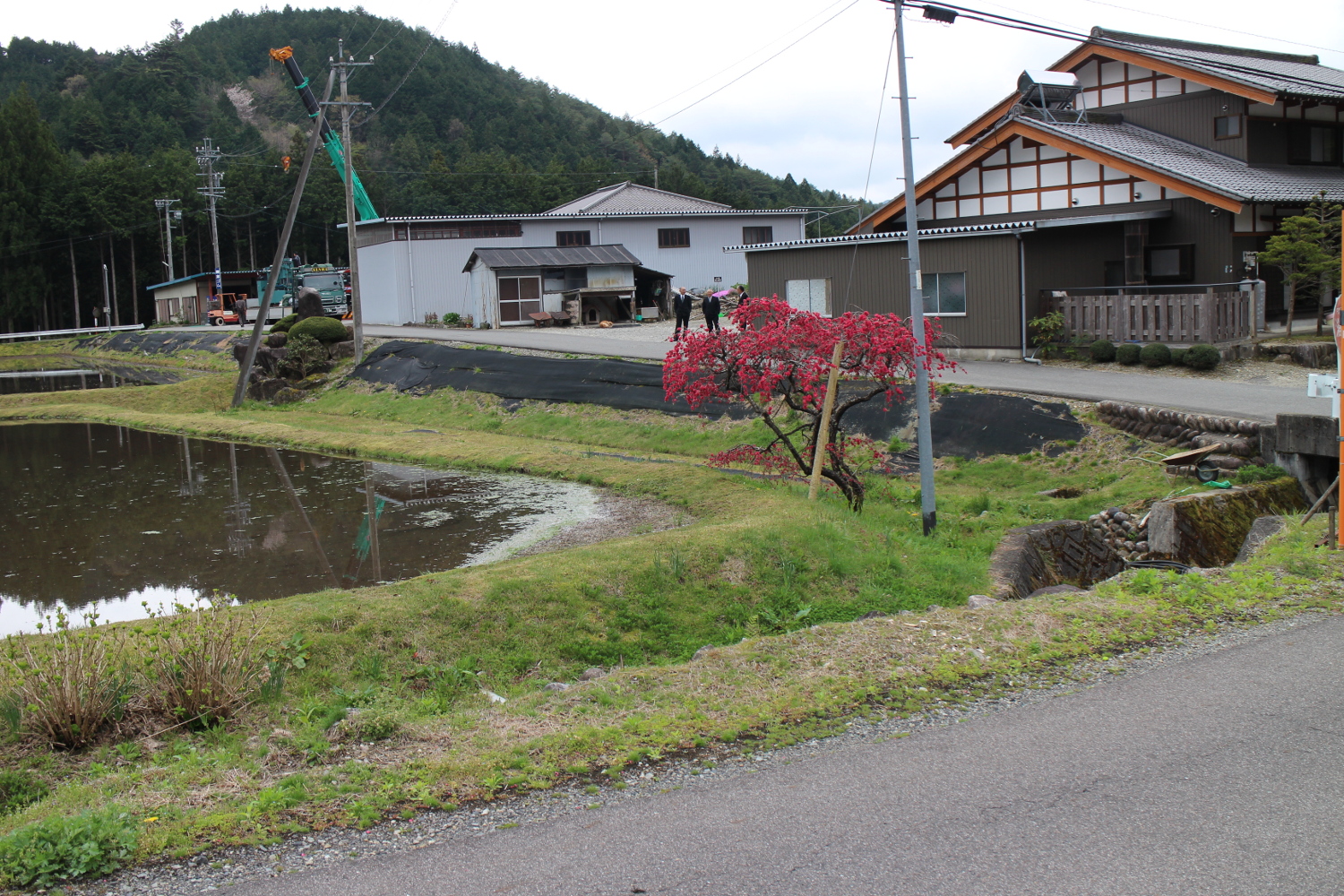 三ツ石における湯ヶ峰断層の低断層崖(人家前の道路と水田との間の段差) (撮影:小井土由光) |
