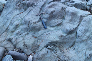 飛騨外縁帯は、飛騨帯の南側を取りまくように幅数~30kmほどで細長く分布する地質帯である。岐阜県地域では飛騨山脈の槍ヶ岳(標高3180m)付近から高山市の奥飛騨温泉郷、丹生川町北部~国府町地域、清見町楢谷(ならだに)、郡上市白鳥町石徹白(いとしろ)などに断片的に配列して露出している。そこを構成している岩石はかなり変化に富み、古生代に形成された非変成の砕屑岩類や火山岩類、結晶片岩などからなる変成岩類、超苦鉄質岩(U)から変化した蛇紋岩と呼ばれる岩石などである。これらの岩石は、飛騨帯構成岩類を一部に含めた当時の大陸(中朝地塊と呼ばれる)の東縁で形成された陸棚や浅海性の堆積物および火山砕屑物が中生代ジュラ紀中ごろまでに大規模な横ずれ運動をともなって飛騨帯構成岩類と接するようになり、その過程でもたらされた変成岩類や超苦鉄質岩を断片的にともなって形成されたと考えられている。ただし、飛騨外縁帯と飛騨帯との間には、富山県地域や新潟県地域などにおいて宇奈月帯あるいは蓮華帯と呼ばれる変成岩類で構成された地帯が分布しており、岐阜県地域においてもそれらとよく似た性質の岩石が断片的に分布するが、よくわかっていない点もあるため、ここではすべて飛騨外縁帯の構成岩類として扱う。